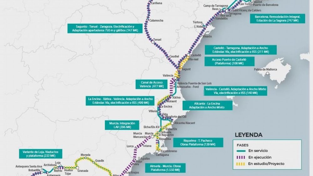 En paral·lel, el Corredor Mediterrani, una de les infraestructures ferroviàries més rellevants a Espanya, continua avançant amb l'objectiu de connectar a les principals ciutats de la costa mediterrània amb la resta del continent europeu. Este projecte, que forma part d'un pla més ampli per a la creació d'una xarxa transeuropea d'alta velocitat, es troba en ple desenvolupament i es preveu que estiga operatiu en 2027, segons va anunciar el Ministre de Transports, Óscar Puentes.