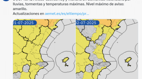 Avisos activos de la AEMET por lluvias, tormentas y temperaturas máximas en la Comunitat Valenciana, vía X.