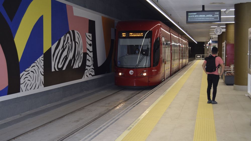 Un tramvia arribant a la parada d'Alacant, a Russafa