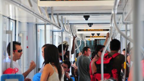 Un grup d'usuaris viatja a l'interior d'un tramvia de Metrovalencia