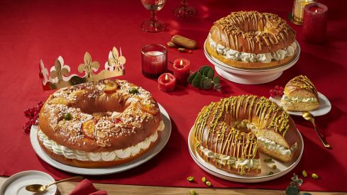 Una massa esponjosa de brioix amb mantega, ou i aroma de tarongina es fon amb un farciment de crema amb gust de pistatxo, col·locat també en trossets com a topping. Un gest perfecte per a un tortell que no passa desapercebut.