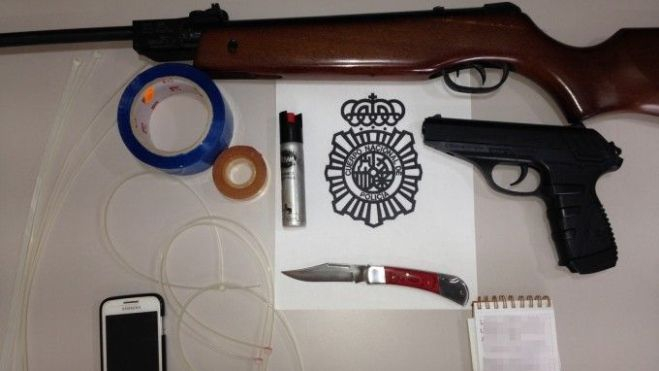Els agents li van intervenir en una bandolera i en el maleter del cotxe una navalla, vuit brides de plàstic de les quals quatre estaven preparades per a tancar d'una tirada, un esprai de gas pebre i un rotllo de cinta americana. Mare i fill presentaven diverses lesions. Els policies van realitzar un registre domiciliari on van intervenir una carabina i una pistola d'aire comprimit i un telèfon mòbil.