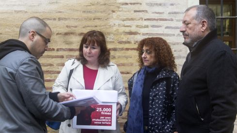 El dimarts al matí diversos membres d'algunes de les associacions de defensa animal que formen la Plataforma Carles Pinazo es reunien davant les portes del Centre UNESCO a València per a fer entrega de les quasi 25.000 firmes que esta entitat ha arreplegat en els últims dos mesos en la seua campanya "Falles sí, però sense tortura".