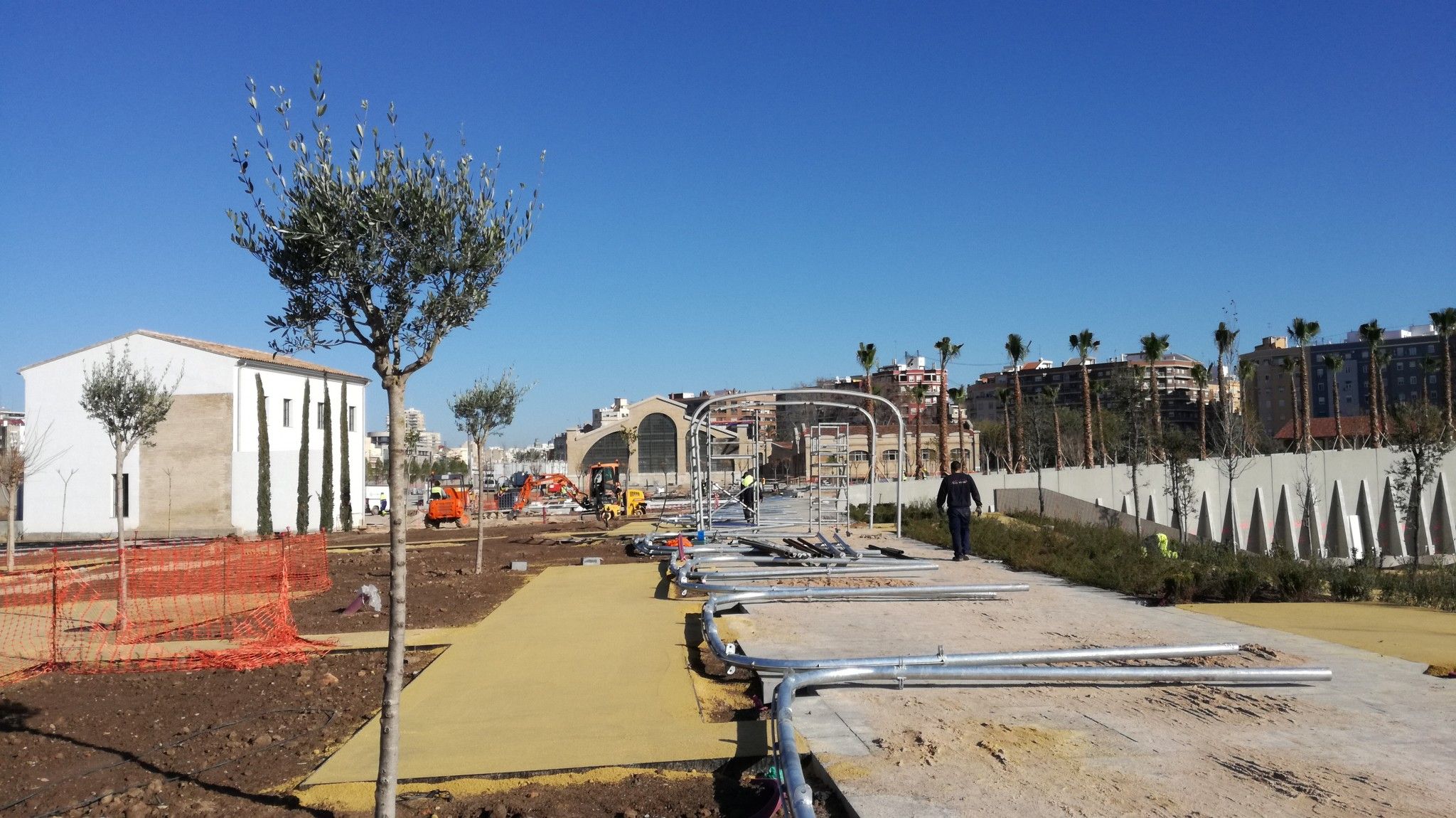 Cada vegada queda menys per a la inauguració del Parc Central de València. Almenys, de la primera fase. Les obres avancen sense parar perquè enguany estiguen accessibles als veïns i visitants tots els espais: el gran jardí, les quatre naus, una pèrgola, un espai de sociabilització de gossos i una altra de jocs infantils, entre altres.