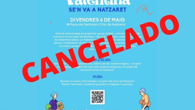 L'Ajuntament de València ha cancel·lat fa poc les activitats que s'anaven a dur a terme aquesta vesprada en el marc de La Valentina en senyal de dol per la mort d'una persona en l'incendi ocasionat aquesta vesprada en el barri de Natzaret. Tant el compte del Consistori, com la vicealcaldessa i responsable d'Urbanisme Sandra Gómez han comunicat la suspensió i han lamentat la trista notícia.