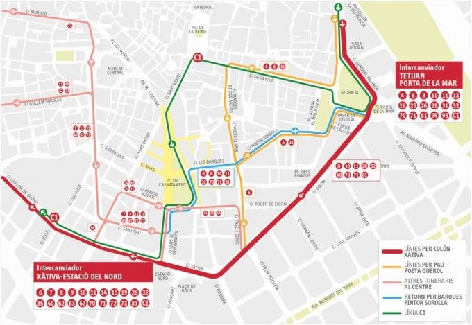 Entre aquests canvis en les línies de l'EMT destaca la creació de la C1, que adoptarà el recorregut de la Línia 5, que desapareixerà, i que a més serà l'única que accedisca tant per la plaça de la Reina, com per la plaça de l'Ajuntament connectant els bescanviadors de Tetuan – Porta de la Mar i Xàtiva, que es troba en fase de construcció amb una previsió de començar a funcionar abans de l'inici de les Falles 2020.