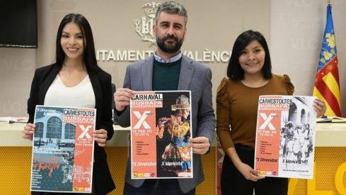 El regidor de Cultura Festiva, Pere Fuset, ha presentat hui en roda de premsa la desena edició del Carnestoltes de Russafa, que se celebrarà el pròxim 15 de febrer a partir de les 17.00 hores, i que esta edició posseix el lema ‘X Diversitat X Memòria”. Participaran un total de 60 grups artístics i col·lectius socials de diferents països, 17 bandes de la coordinadora de societats musicals de València i 30 agrupacions de batukades i moviments socials, en una festa que per a Fuset “és un exemple d'integració, un espai lliure de violència de gènere, racisme, transfòbia, homofòbia i xenofòbia”.