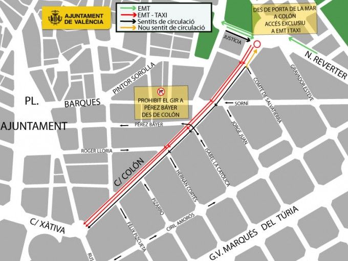Un altre dels canvis significatius de la nova xarxa de l'EMT és que no serà possible accedir a Colón des de Porta de la Mar amb vehicle privat, però sí amb els autobusos. En concret, només es podrà accedir per Roger de Lauria, Conde Salvatierra, Sorní, Pizarro i Isabel la Catòlica.Des del carrer Conde Salvatierra fins a Gravador Esteve canviarà el sentit de la circulació i es podrà accedir cap a la dreta perquè, segons ha explicat Grezzi, hi ha un pàrquing privat que cal respectar. A més, estarà prohibit el gir a Pérez Báyer des del carrer Colón.