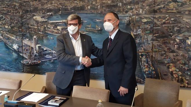El director del Centre Nacional de l'Hidrogen (CNH2), Emilio Nieto, i el president de l'Autoritat Portuària de València (APV), Aurelio Martínez, han signat aquest dimecres un conveni de col·laboració que el port de València siga "el primer port europeu a utilitzar tecnologies de l'hidrogen per a reduir l'impacte ambiental".