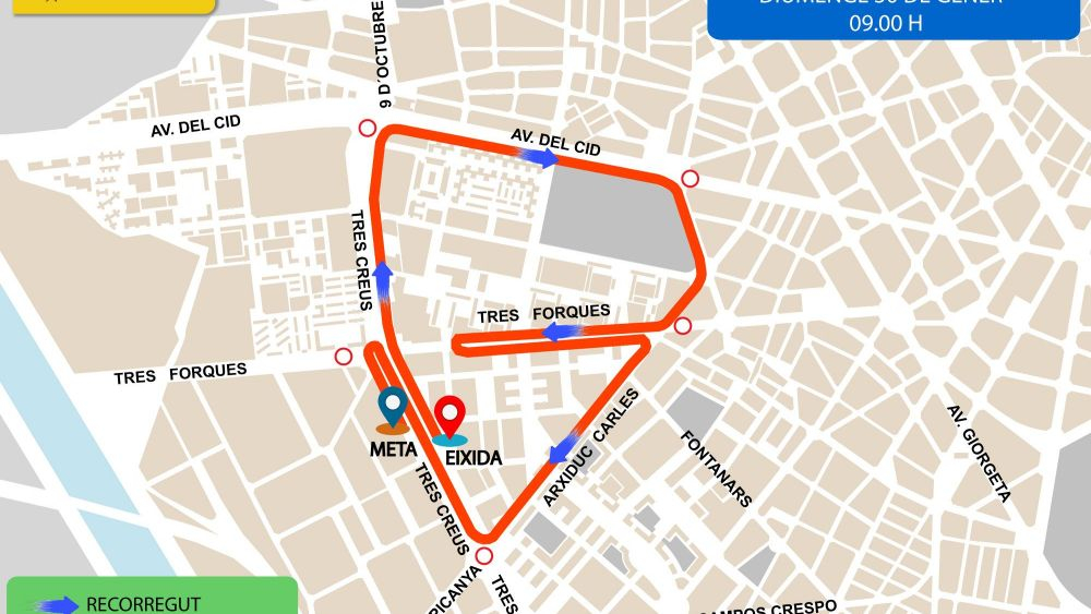 L'itinerari previst partirà des del número 75 de l'avinguda Tres Creus (en la confluència d'aquesta via amb el carrer Torrent), per a continuar per les avingudes del Cid, de l'Arxiduc Carles, i Tres Forques fins a l'encreuament amb Tres Creus, per a tornar de nou per Tres Forques (pel costat dels nombres imparells), i continuant per Arxiduc Carles, Tres Creus, i rotonda amb Tres Forques fins a arribar a la meta establida en el número 38 de l'avinguda Tres Creus. L'organització calcula que la prova haurà conclòs al voltant de les 10.15 hores.
