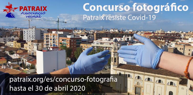 L'Associació Veïnal de Patraix impulsa el Concurs de Fotografia Patraix Resisteix COVID-19 amb fins solidaris i d'implicació ciutadana. El projecte estarà obert a la participació del públic en línia des de demà, dissabte 4 d'abril, fins al pròxim dijous 30 d'abril. Les fotografies hauran de representar, preferiblement, valors positius que s'hagen despertat amb la crisi del coronavirus en el barri. Qualsevol persona podrà pujar una imatge capturada per ella a la web del concurs i valorar les de la resta de participants a través de les xarxes socials. Un jurat triarà les fotografies guanyadores entre les 20 més votades, i hi haurà un premi de 100 euros i dos accèssits de 200 euros que constituiran donatius econòmics destinats a les organitzacions que seleccionen les persones guanyadores per a pal·liar els efectes de la crisi.