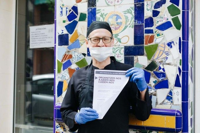 Un comerciant amb el full de la Xarxa de Suport Mutu. Julia Reoyo (Caixa Fosca Fotografia)
