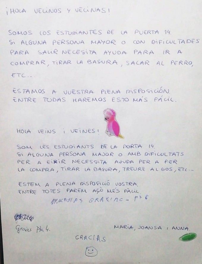 Toni Pla, president de l'Associació Veïnal de Patraix: «Els qui millor poden conéixer les necessitats del veïnat són els seus membres»Aquesta solidaritat porta a porta s'està fent palesa en molts habitatges valencians. Gent jove que deixa notes als ascensors de la seua finca per a prestar-se a ajudar a aquelles persones que ho necessiten, població de risc que mostra el seu agraïment amb escrits, llibres i dolços, veïns i veïnes que ofereixen el seu contacte a la resta del veïnat per a oferir el seu suport... No hi ha dubte que el suport mutu és ja una realitat en aquesta crisi sanitària i social.