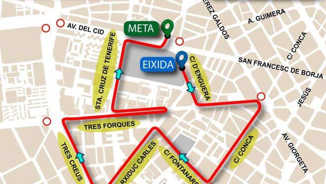 El recorregut de la carrera d'aquest diumenge, 6 de novembre, serà el següent: carrer d'Enguera i avinguda de Tres Forques fins a arribar a l'altura de Pérez Galdós, per a continuar pels carrers de Conca, Pius XI, Fontanars dels Aforins, avingudes de l'Arxiduc Carles i de Tres Creus, amb gir per Tres Forques fins a l'encreuament de nou amb el carrer d'Énguera. En aquest punt, les corredores i els corredors faran un gir de 180º i continuaran en sentit invers una altra vegada per l'avinguda de Tres Forques i el carrer Santa Cruz de Tenerife, fins a arribar al pati interior de la Central de la Policia Local.