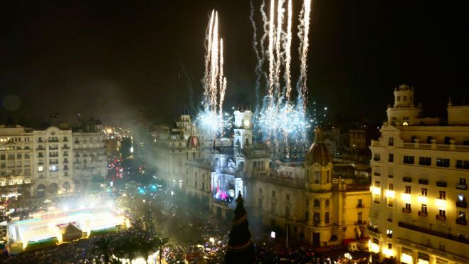 Una de les grans novetats d'esta Nit de Cap d'Any serà el doble espectacle pirotècnic. Per un costat, la plaça de l'Ajuntament viurà les campanades amb un tret de 90 segons des de la terrassa de l'edifici consistorial, amb efectes de categoria T1 i T2, dissenyats per a garantir la seguretat del públic i la protecció de l'entorn arquitectònic.