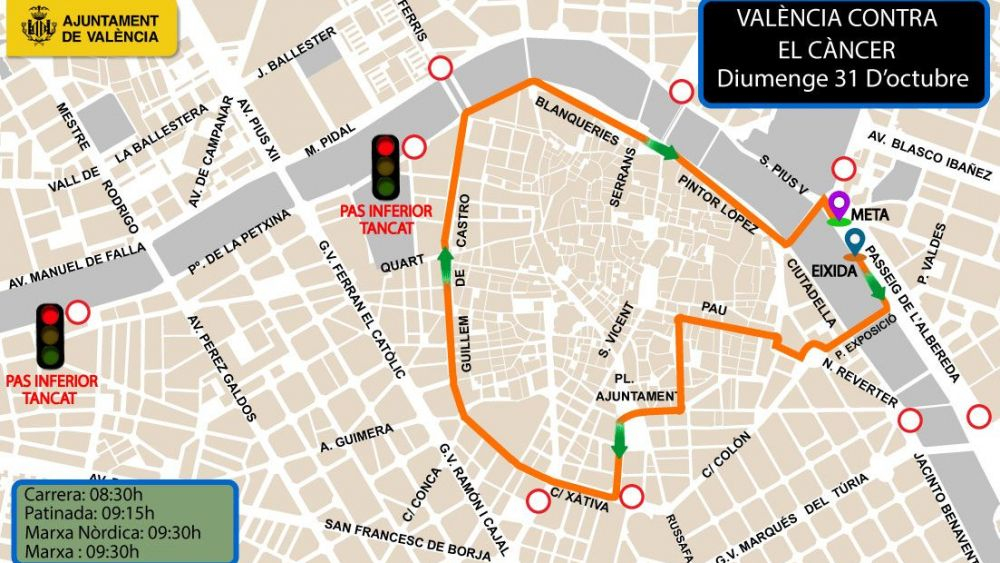Els carrers de la ciutat acolliran diumenge la VI Carrera València contra el Càncer. Aquesta prova solidària, organitzada per l'Associació Espanyola contra el Càncer de València, reunirà unes 8.000 persones mobilitzades per promoure la investigació d'aquesta malaltia. El desenvolupament de les diferents proves comportarà afeccions a la circulació en la zona centre i ronda interior de 08.30 a 10.45 hores.