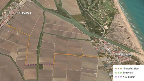 L'alternativa proposada (alternativa 2) discorre en gran part del seu traçat per terrenys de titularitat pública. Els trams de nou traçat ocupen tres parcel·les de titularitat privada, travessen la séquia Carrera de la Junça i una xicoteta séquia de menor importància, i discorren sobre la séquia soterrada del costat del Palmar. Aquests trams de nou traçat permeten l'exclusivitat de l'ús per a vianants i ciclistes, mentre que els ja existents hauran de compatibilitzar-se amb el pas ocasional de vehicles, fonamentalment en la zona del Perellonet.