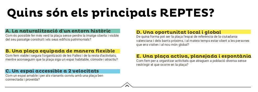 Del procés, la Regidoria extrau diversos reptes principals. El primer és, precisament, la "naturalització d'un entorn històric". "És un repte que hauran d'afrontar els equips redactors; com compaginar massa verda amb la posada en valor de les façanes i elements arquitectònics", ha assenyalat Vàlua. El segon de les restes consisteix a crear una "plaça equipada de manera flexible", que permeta la celebració d'esdeveniments com les mascletàs, però també d'altres activitats a menor escala i l''ús ciutadà' durant la resta de l'any, amb llocs per a asseure's i conversar.