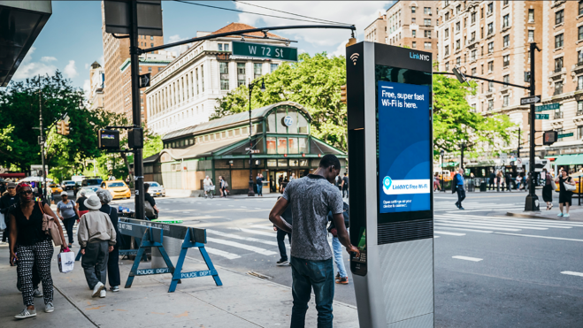 Persona utilitzant LinkNYC, les cabines telefòniques del segle XXI