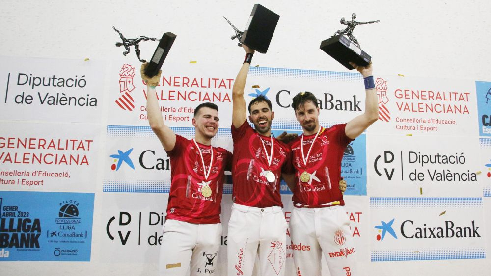 Per molt dura que siga la sequera, les partides per a la història mai deixen de ploure en Pelayo. La Lliga CaixaBank d'escala i corda 2023 és, des d'ahir, patrimoni material de Puchol II, Álvaro i Hilari. El trio de La Pobla de Vallbona es va proclamar campió de la competició per equips més important de la temporada en derrotar 60-45 el trio de José Salvador, Nacho i Guillermo (Vila-real) en una llarga i irregular final disputada a Pelayo. Més de dues hores de partida, més emocionant que espectacular, en un trinquet que va tornar a respirar l'ambient de les grans ocasions. Un duel d'alt voltatge que es va resoldre, de nou, gràcies al talent inesgotable de Puchol II i les mans plenes d'il·lusió d'Álvaro, Hilari i el jove Andreu, protagonista des de la pedra de ferir.